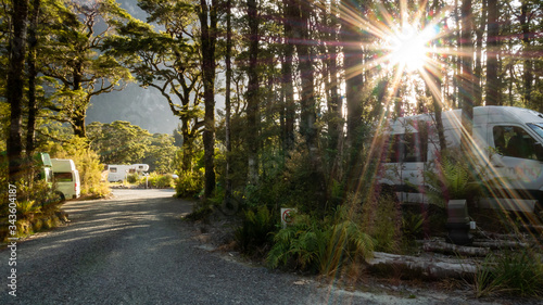 Sun star shot of campsite located in woods with camper vans, RVs and gravel path leading through frame. Photo taken in Milford Sound, Fiordland National Park, New Zealand