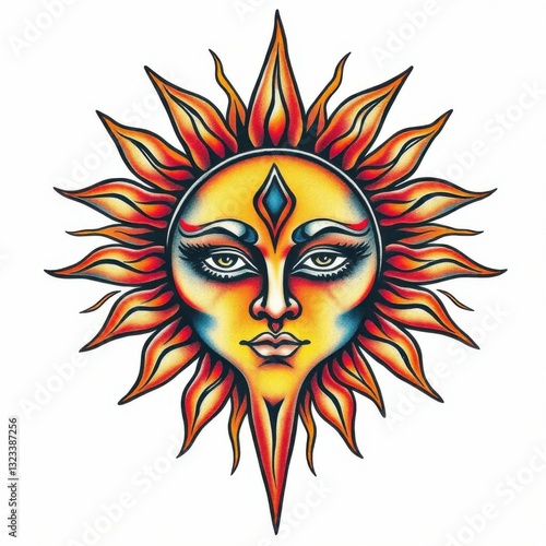 sun, face, solar, energy, warmth, symbol, light, celestial, radiance, yellow, orange, glow, nature, art, drawing, illustration, vintage, style, design, classic, old school, retro, tattoo, traditional, spiritual, astrology, star, ray, bright, dawn, dusk, heaven, sky, cosmic, power, vibrant, sunny, calm, eye, lip, happy, smiling, good, beautiful, decoration, artistic, sun ray, sunbeam