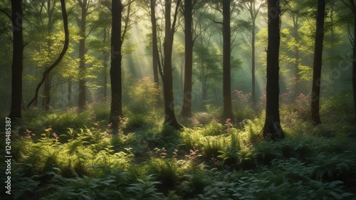 forest, wood, tree, sunbeam, sunlight, mist, fog, morning, flower, blossom, greenery, plant, fern, underbrush, timberland, nature, landscape, scenic, peaceful, tranquil, serene, magical, mystical, aethereal