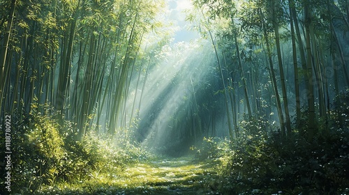 bamboo, forest, sunbeam, path, tree, green, nature, sunlight, wood, plant, leaf, light, landscape, scenery, background, summer, spring, tranquil, serene, peaceful, mystical, magical, dreamy, vibrant, bright, shadow, foliage, jungle, growth, ecology, environment, beauty, scenic, wilderness, flora, vegetation, pathway, way, trail
