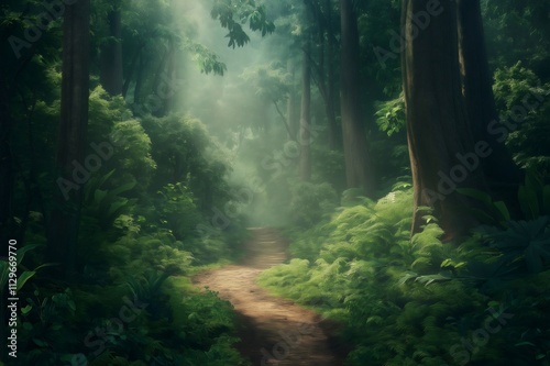 forest, path, pathway, tree, nature, wood, green, landscape, light, sun, mist, fog, mysterious, jungle, trail, environment, wilderness, scenery, sunlight, morning, atmosphere, mystical, magical, fairy tale, enchanted, serene, tranquil, peaceful, wood, leaf, fern, moss
