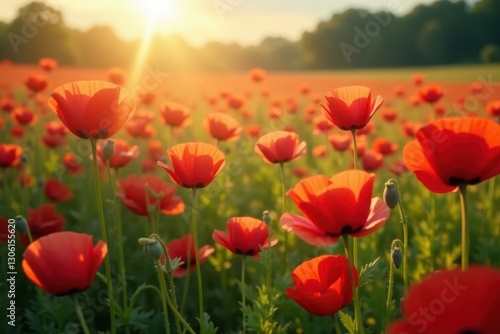 Sunbeams illuminate a sea of poppies, swaying gently , scenic, field