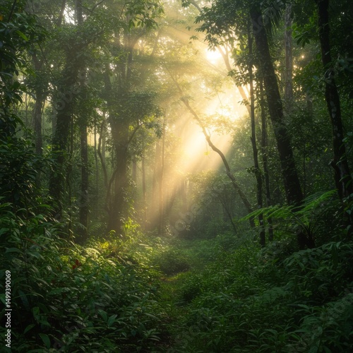 forest, sunlight, tree, green, nature, morning, light, path, wood, jungle, tropical, sunbeam, ray, foliage, vegetation, lush, dense, canopy, mist, fog, atmosphere, peaceful, serene, tranquil, calm, magical, mysterious, dark, shadow, gold, warm, bright, vibrant, scenic, landscape, environment, habitat, wildlife, ecosystem, flora, botanical, photo, image, picture
