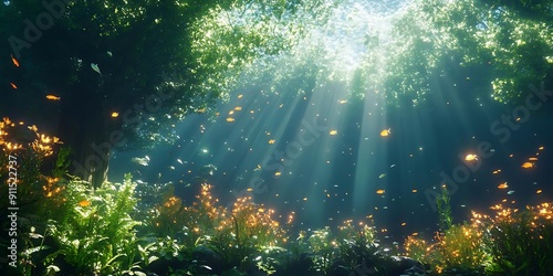 Sunbeams Illuminate Underwater Forest with Fish