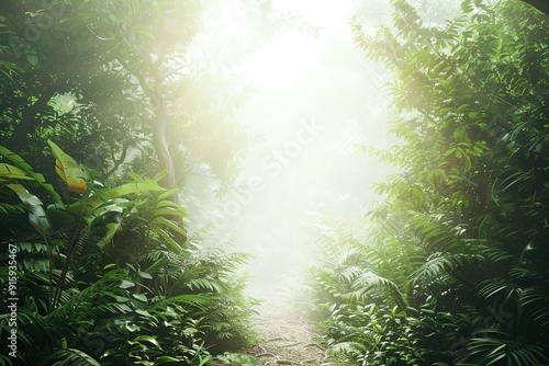 Sunbeams illuminating dense forest trail
