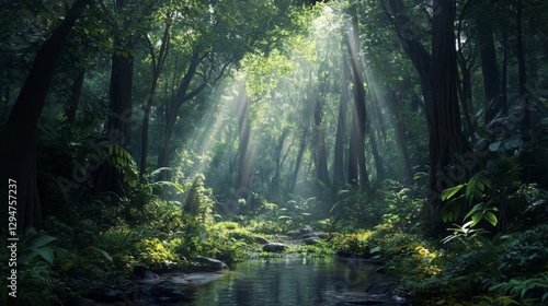 Sunbeams in Lush Green Forest with Tranquil Stream