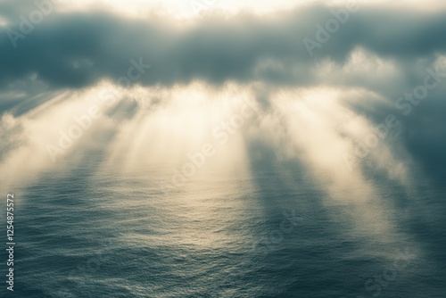 Sunbeams pierce through clouds above a tranquil ocean. Perfect for projects needing serene, spiritual, or hopeful themes.