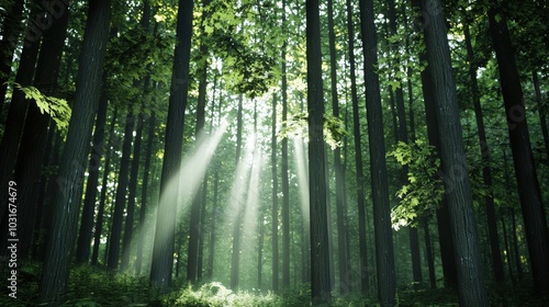 forest, tree, sunlight, sunbeam, wood, timberland, green, nature, landscape, scenery, natural, environment, foliage, canopy, branch, leaf, light, ray, morning, dawn, summer, spring, calmness, peaceful, serene, magical, mystical, scenic, beauty, background, wallpaper, illustration