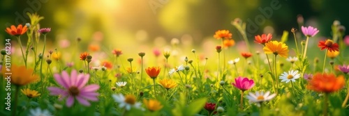 Sun-drenched meadow; diverse flowers provide insect food & shelter , natural beauty, colorful