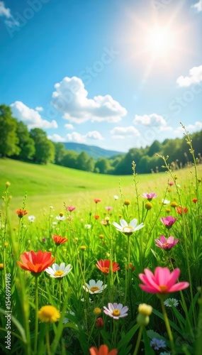 Sun-drenched meadow in summer, wildflowers blooming vibrantly, lush green grass swaying gently in the breeze Perfect for nature, summer, and idyllic themes , rural, colorful, serene
