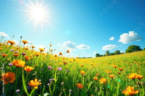 Sun-drenched meadow, vibrant wildflowers, azure sky, optimistic, idyllic, outdoor
