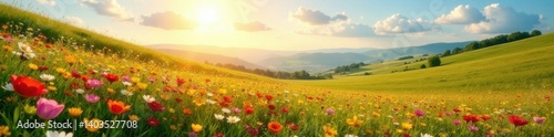 Sun-drenched meadow, vibrant wildflowers, rolling hills, trees, sunlight