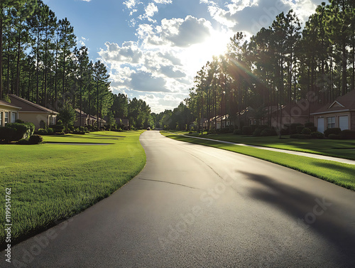 Sundrenched suburban street lined with homes and lush green lawns. Perfect for real estate, lifestyle, or community projects. Warm, inviting atmosphere.