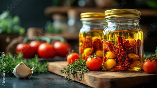 tomatoes, oil, sun-dried, herb, kitchen, rustic, jar, food, cooking, receipe, italian, mediterranean, healthy, delicious, fresh, ingredient, vegetable, epicure, gastronomy, photo, still life, closeup, background, dark, wooden, board, glasses, organic, natural, diet, favor, taste, culinary, snack, spice, seasoning, preserve, home, market, produce, harvest, vitamin, antioxidant