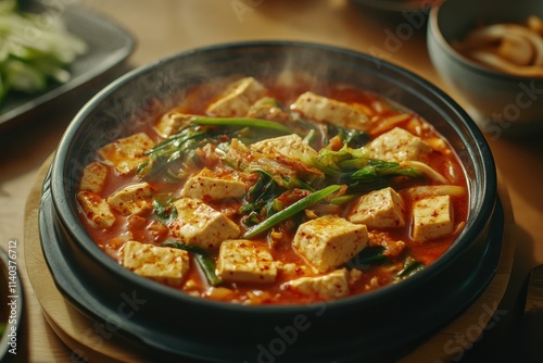 Sundubu Jjigae a classic Korean stew features silky uncurdled tofu in a spicy broth shown in a bowl on a table