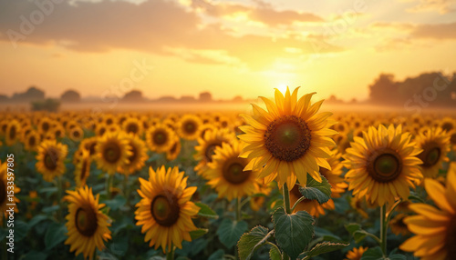 sunflower, field, sunrise, yellow, flower petals, green, leaf, stem, sun, cloud, sky, horizon, warm light, golden hour, dawn, agriculture, crop, rural, nature, outdoors, bloom, blossom, plant, flora, countryside, landscape, fog, mist, tree, background, foreground, center, bright, vibrant, floral, disc, stalk, row, row, patch, gold, glowing, soft, peaceful, scenic, daybreak, golden light