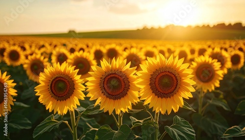 sunflower, shine, yellow, sunny, warm, field, farm, sunset, sky, horizon, landscape, country, rural, gold, peaceful, serene, agricultural, natural, summer, seasonal, bright, bloom, growth, sunlight, plant, garden, day, background, decoration, nature, flora, outdoors, scenic, imagery