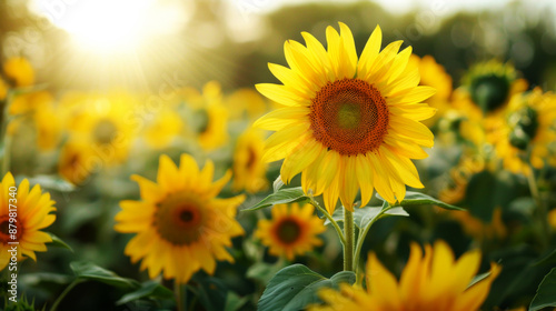 Sunflowers bloom in a wide expanse of garden, the atmosphere is hot and the sun is hot during the day