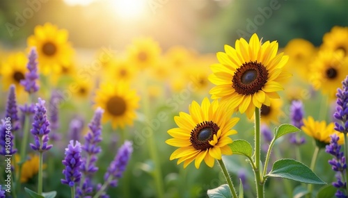 Sunflowers, daisies, lavender in soft, flowing field , shapes, stem, summer