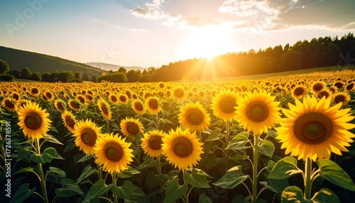 sunflower, field, sunset, gold, nature, landscape, summer, bright, sky, cloud, yellow, warm, rural, panorama, beautiful, agriculture, plant, golden hour, growth, vibrant