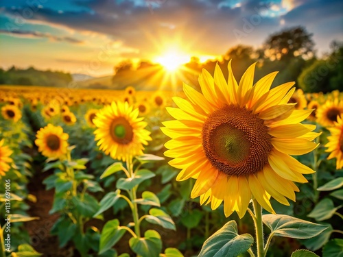 sunflower, garden, summer, field, flower, bloom, gold, yellow, flower petals, green, leaf, meadow, bright, sunny, vibrant, photo, image, background, copy space, right, happy, cheerful, nature, botany, plant, agriculture, rural, landscape, scenic, beautiful, picturesque, sunlight, ray, golden hour, floral, wildflower, closeup, macro, detail, texture, art, design