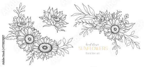 sunflower, line art, flower, minimalist, floral arrangement, botanical, illustration, outline, bouquet, simple, hand-drawn, delicate, black-and-white, floral