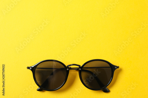 Sunglasses on color background, space for text and closeup. Fashionable accessories