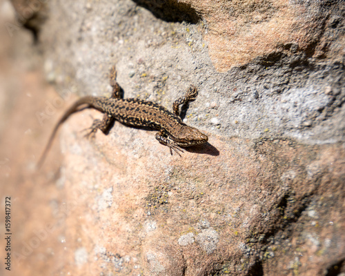 Sun-Kissed European Wall Lizard Basking on Textured Stone: Captivating Wildlife Close-Up for Nature & Reptile Enthusiasts