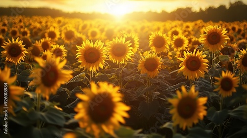 Sun-Kissed Sunflower Field: A breathtaking panorama of sunflowers bathed in the golden glow of a setting sun. The vibrant blooms stand tall against a backdrop of endless fields.