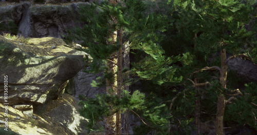 forest, sunlight, tree, green, nature, rock, landscape, foliage, outdoors, wilderness, scenery, trunk, leaf, environment, illumination, shadow, calmness, growth, natural, flora, mountain, serenity, park, hiking, adventure, summer, scenic, trail, timberland, pathway, branch, peaceful, ecology, botanical, altitude, wildlife, ecosystem, earth, atmosphere, exploration, beauty, serene, daylight, greenery, rustic, charme