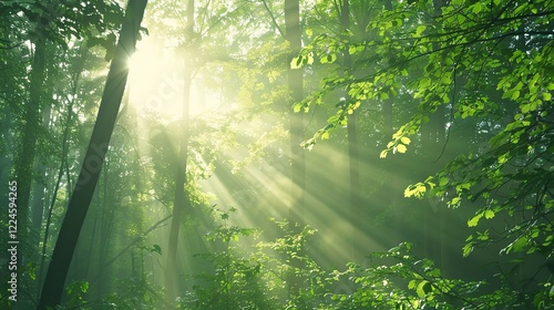 forest, tree, green, sun, sunlight, beam, nature, timberland, leaf, light, beautiful, peaceful, serene, tranquil, calm, outdoors, landscape, background, lush, summer, spring, morning, daybreak, dawn, gold, yellow, bright, natural