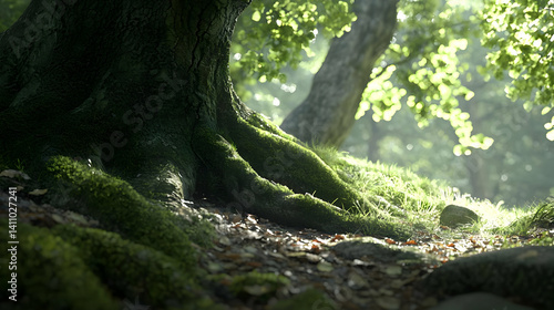 forest, tree, moss, root, nature, green, sunlight, daylight, wood, leaf, ground, flora, foliage, timberland, landscape, outdoors, tree, nature scene, grass, plant, environment, detail, closeup, light, shadow, natural light, forest floor, morning light, calm, peaceful, tranquil, serene, quiet, still, beauty, scenic, environmental, natural, photo, photo, image, ground cover