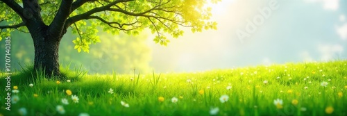 Sunlight dapples a lush meadow, delicate branches reaching towards the sky, creating a tranquil and idyllic scene Perfect for nature, spring, or environmental themes , countryside, pastoral
