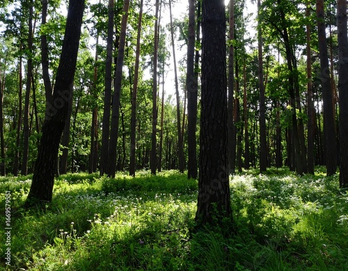 sunlight, forest, tree, trunk, pine, green, shade, flora, nature, dense, tall, lush, grass, plant, meadow, white, flower, ground, beam, wood, canopy, deep, light, dark