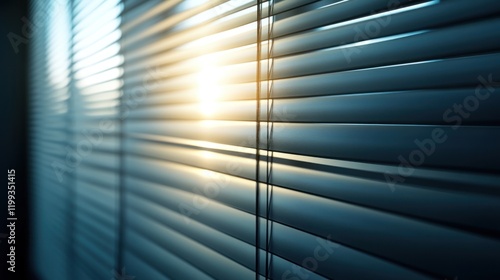 Sunlight filtering through horizontal blinds in a modern room during early morning hours. Generative AI