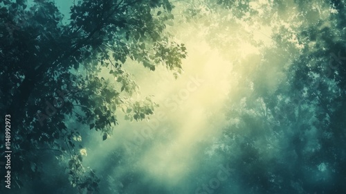 Sunlight Filtering Through Leaves in a Misty Forest Setting