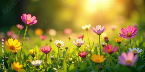 Sunlight filtering through petals of wildflowers in a lush meadow, blooms, natural