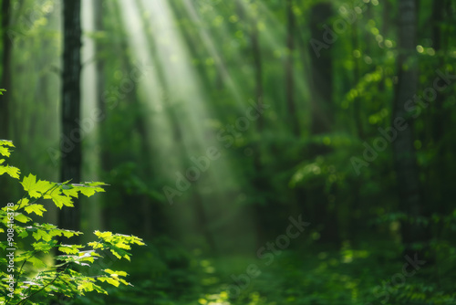 Sunlight filtering through trees in a lush green forest, creating a tranquil and serene natural scene.