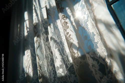 Sunlight filters lace curtains in an interior, creating a warm and inviting atmosphere