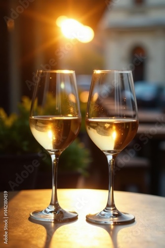 Sunlight glints on wine glasses clinking on a cafe terrace , summertime, summer