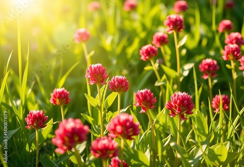 Sunlight illuminates vibrant red clover blossoms amidst lush green spring meadow grass, wallpaper, flora
