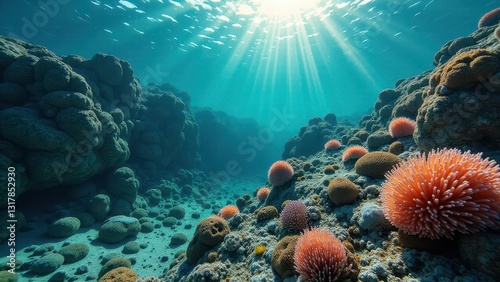 Sunlight illuminating a coral reef on an underwater slope showing signs of bleaching