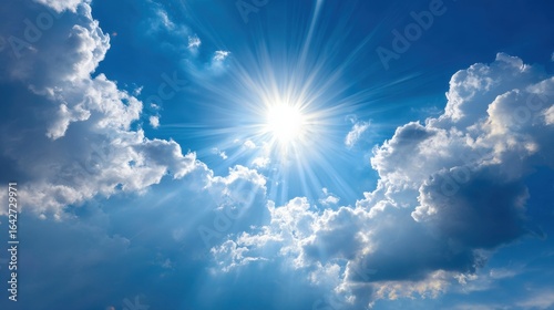 Sunlight radiates through fluffy clouds in a vivid blue sky, creating a serene and uplifting atmosphere. The scene captures the beauty of nature and daylight.