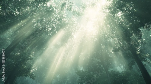 Sunlight streaming through a dense forest canopy creates a serene atmosphere in nature's embrace