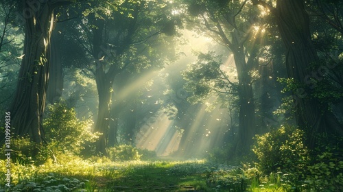 Sunlight streaming through a lush forest illuminating a serene pathway surrounded by greenery and wildflowers
