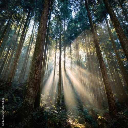 "Sunlight streaming through tall trees in a dense forest.