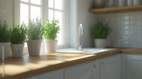 kitchen, pot, wood, fresh, airy, light, modern, cosy, charming, elegant, white, sunlight, homelike, home, rustic, warm, freshness, design, faucet, minimalist, window, simple, plant, natural, sink, herb, interior, cabinet, decor, bright, clean, sunny, peaceful