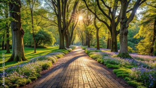 Sunlight streams through a canopy of leaves, illuminating a brick path lined with vibrant purple flowers, creating a picturesque scene of natural beauty.