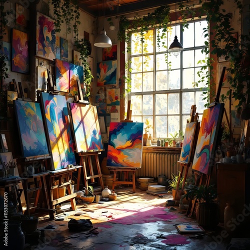 Sunlight streams through a minimalist art studio, highlighting messy creativity.