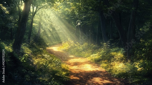 Sunlight streams through a verdant forest path.